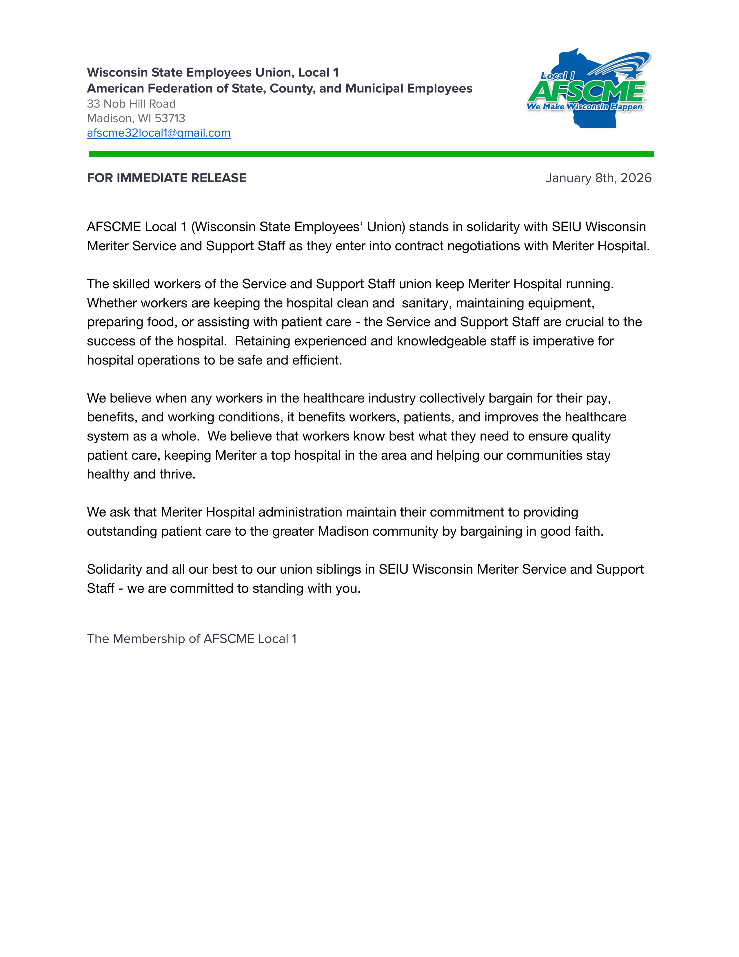 AFSCME Local 1 (Wisconsin State Employees’ Union) stands in solidarity with SEIU Wisconsin Meriter Service and Support Staff as they enter into contract negotiations with Meriter Hospital.